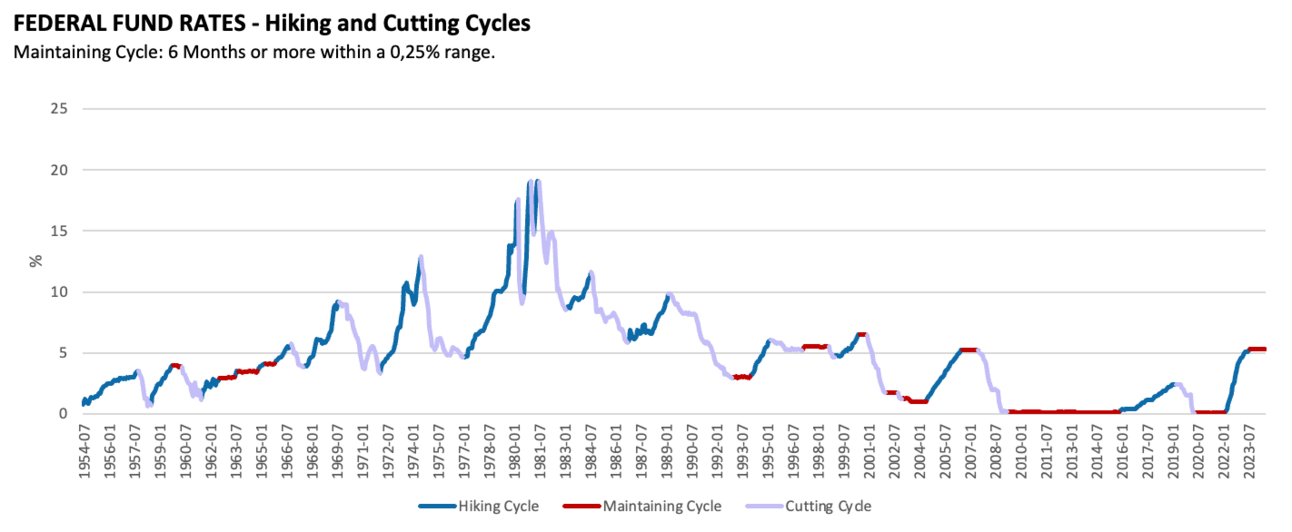 It is often said that bond markets drive the broader market, so paying attention to their signals is crucial. Currently, long-term yields are rising, which is unusual following a Fed rate cut. Is the bond market trying to tell us something? Since 1966, we’ve experienced various rate-cutting cycles, as illustrated in the chart below.