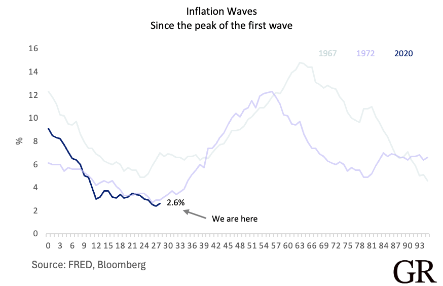 If we measure these inflation curves from the peak of the first wave, we find that we are now at the same point where the second wave of inflation began in both 1967 and 1972. While it’s clear that the economic and political situations in those scenarios differ greatly from the present, the most recent CPI print has halted the downward trend in inflation that we had been expecting. So, what are the possible outcomes moving forward?