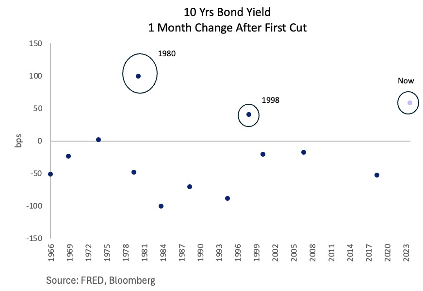 Focusing on the U.S. 10-year Government Bond Yield, we can observe a clear pattern following most rate-cutting cycles: long-term yields typically decline consistently for at least the next 10 months after the cut. However, this time something different is happening. There are very few instances in history where this pattern has not held—specifically in 1980, 1998, and now in 2024.